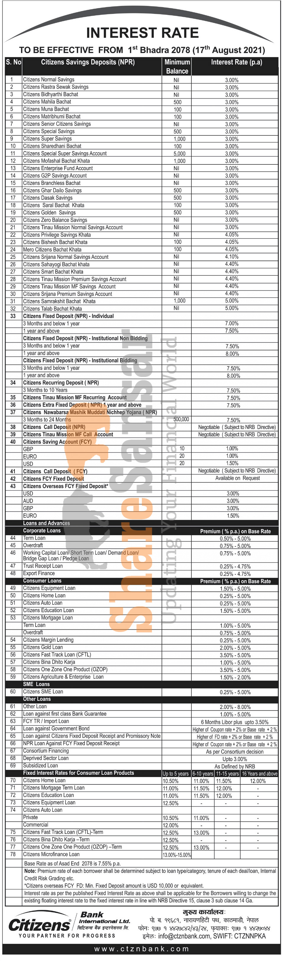 Citizens Bank International Limited has published a notice regarding the new interest rate for deposit and loan products and it's effective from 1st Bhadra, 2078.