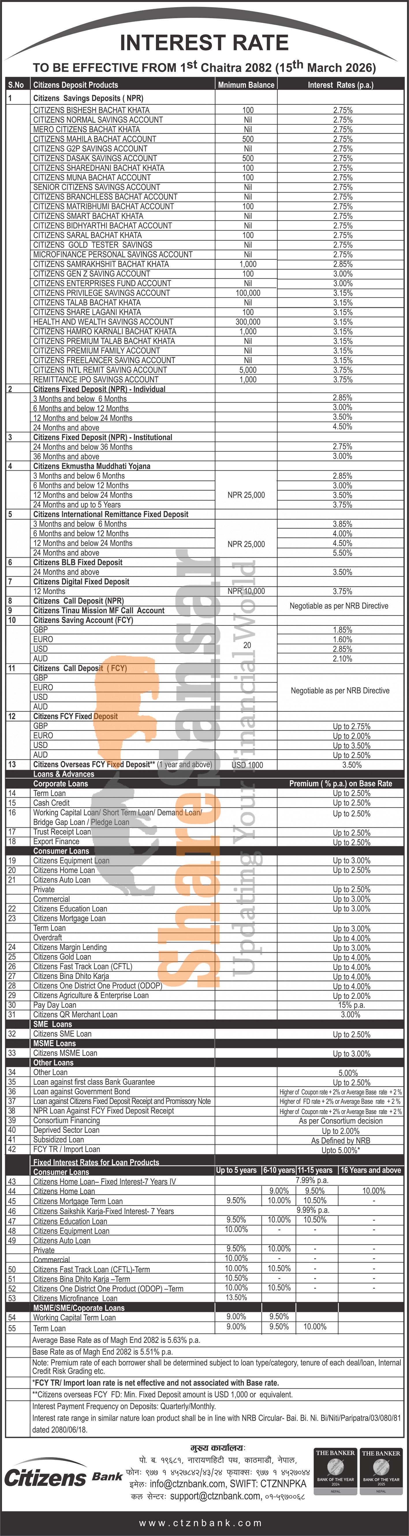 Citizens Bank International Limited has published a notice regarding the new interest rate for deposit products and it's effective from 1st Chaitra, 2082.