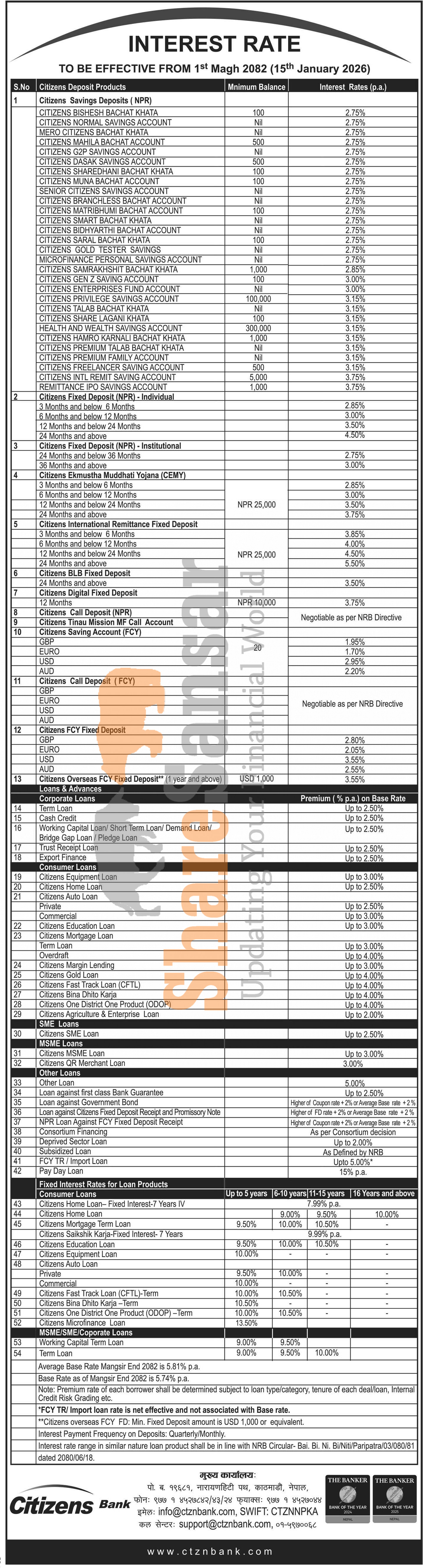 Citizens Bank International Limited has published a notice regarding the new interest rate for deposit products and it's effective from 1st Magh, 2082.