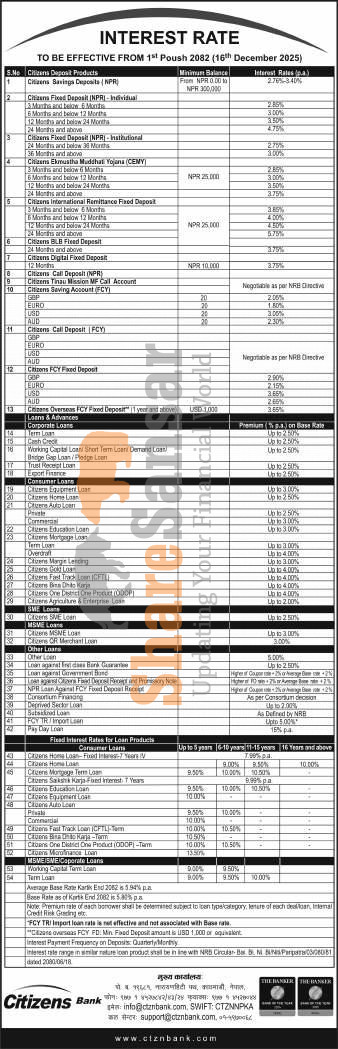 Citizens Bank International Limited has published a notice regarding the new interest rate for deposit products and it's effective from 1st Poush, 2082.