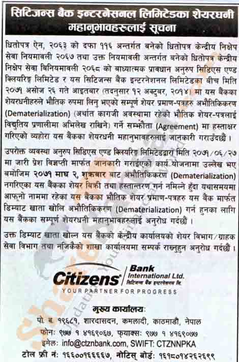 Citizens Bank International Limited has urges its shareholders to dematerialize their securities.