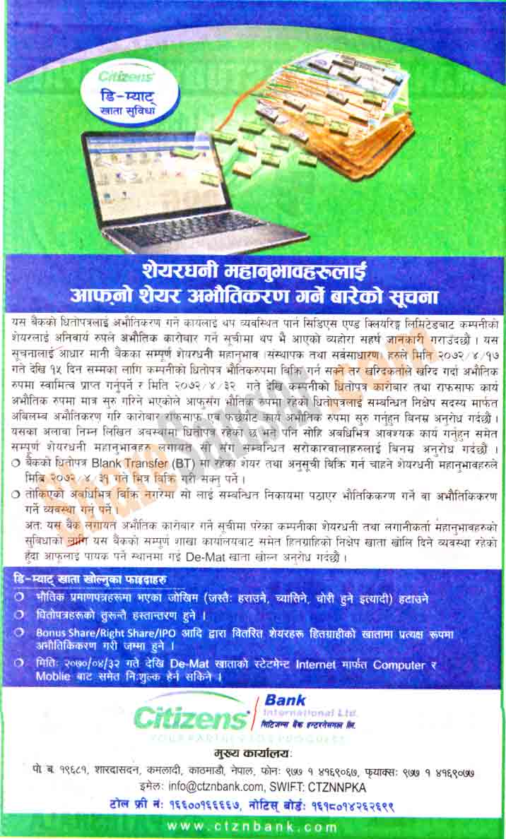 Citizens Bank International Limited urges its shareholders to dematerialize their securities.