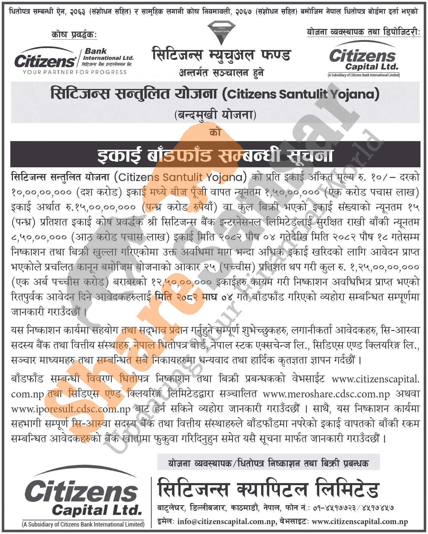 Citizens Capital Limited has allotted its 100 million units of Rs 10 face value each mutual fund scheme "Citizens Santulit Yojana" to the general public on 4th Magh, 2082.