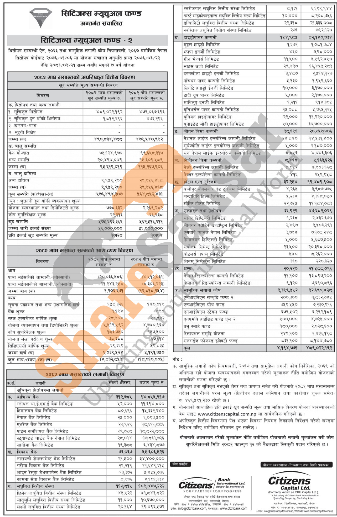 Citizens Capital Limited has published “Citizens Mutual Fund - 2” Net Assets Value (NAV) till Magh, 2082.