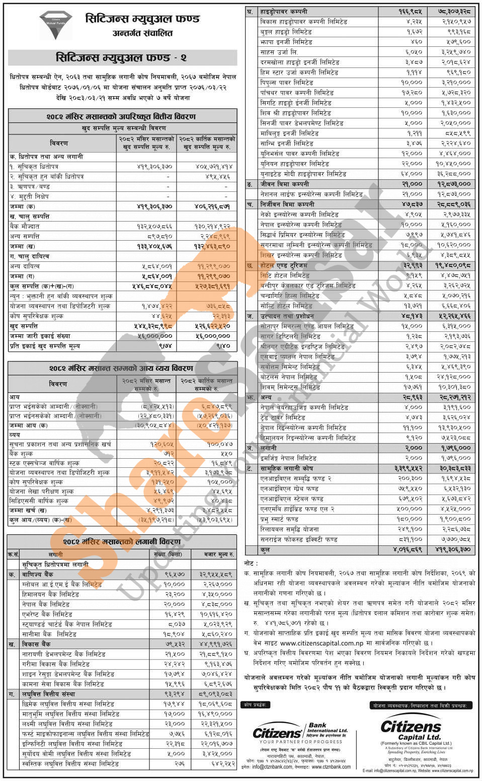 Citizens Capital Limited has published “Citizens Mutual Fund - 2” Net Assets Value (NAV) till Mangsir, 2082.