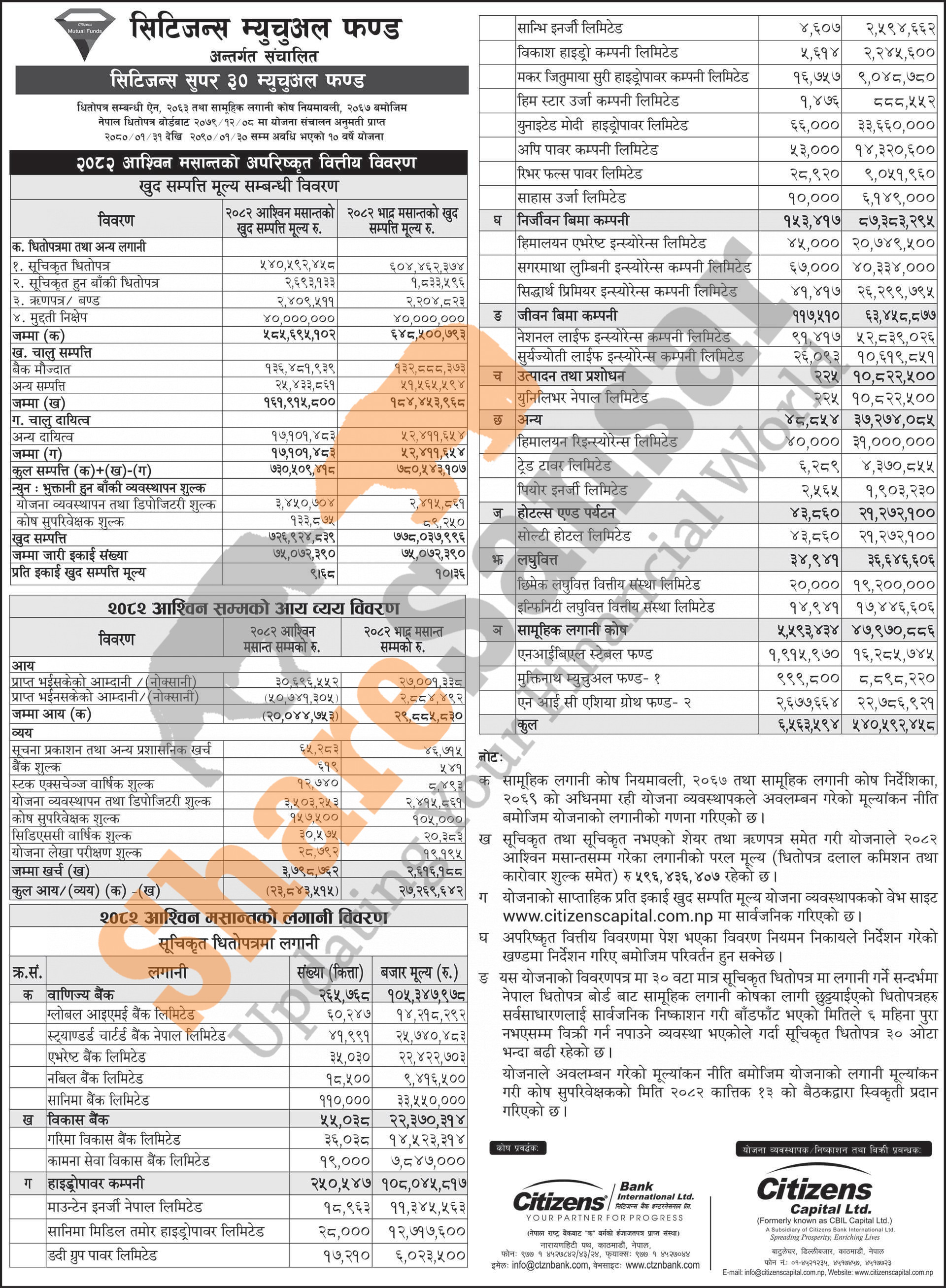Citizens Capital Limited has published “Citizens Super 30 Mutual Fund” Net Assets Value (NAV) till Ashwin, 2082.