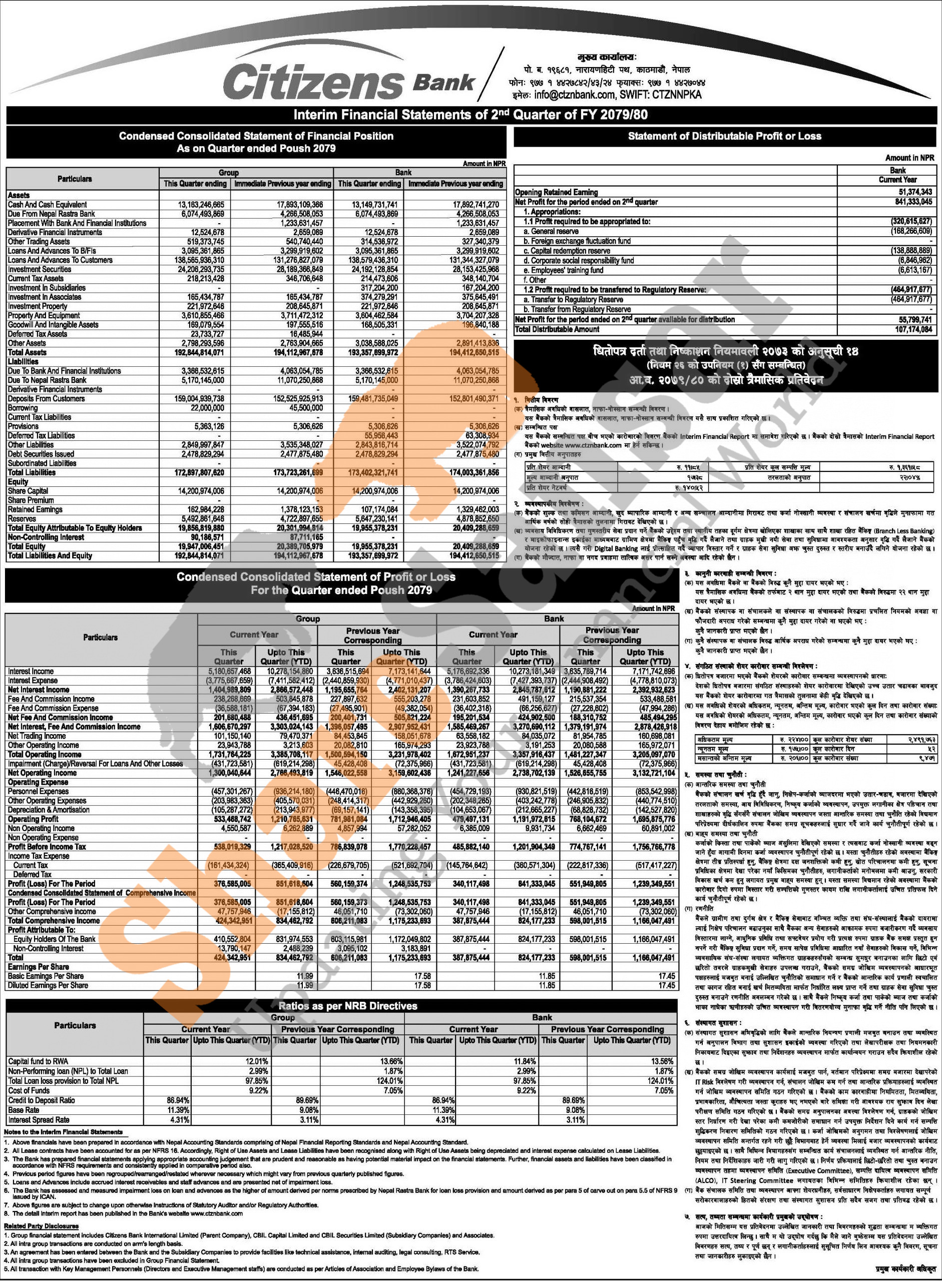 Citizens International Bank Limited has posted a net profit of Rs 841.33 million and published its 2nd quarter company analysis of the fiscal year 2079/80.