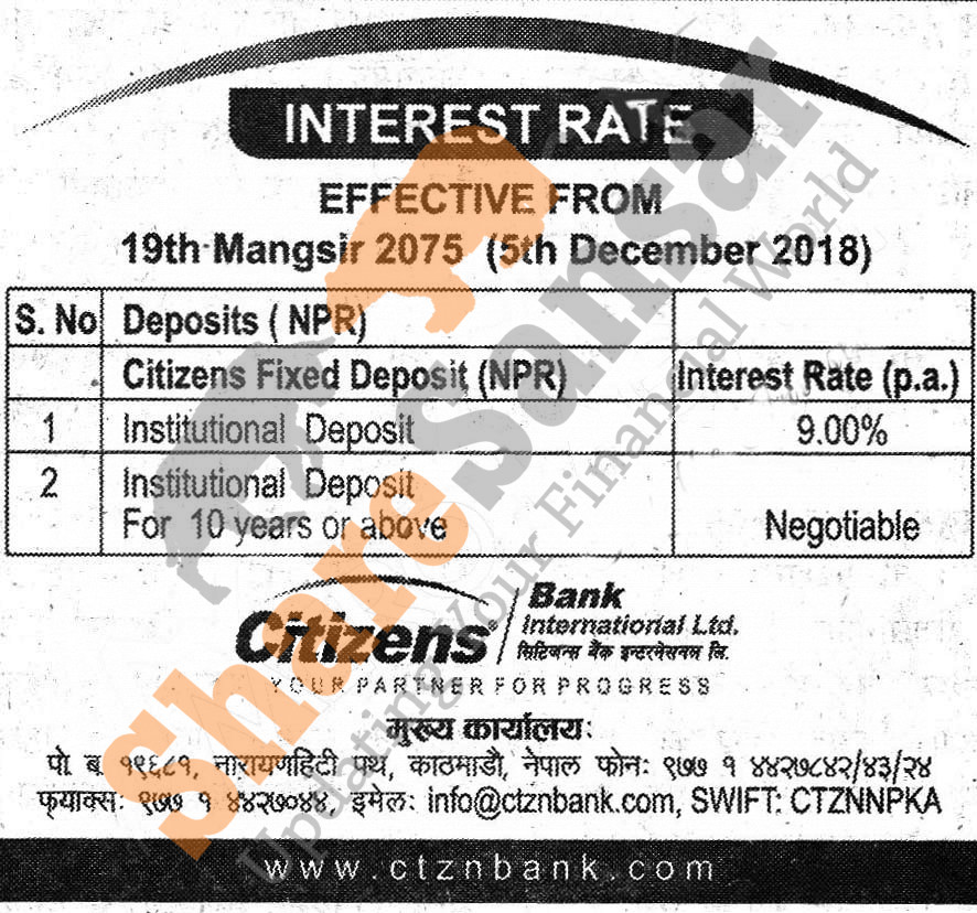 Citizens International Bank Limited has published a notice regarding new interest rate and its effective from 19th Mangsir, 2075.