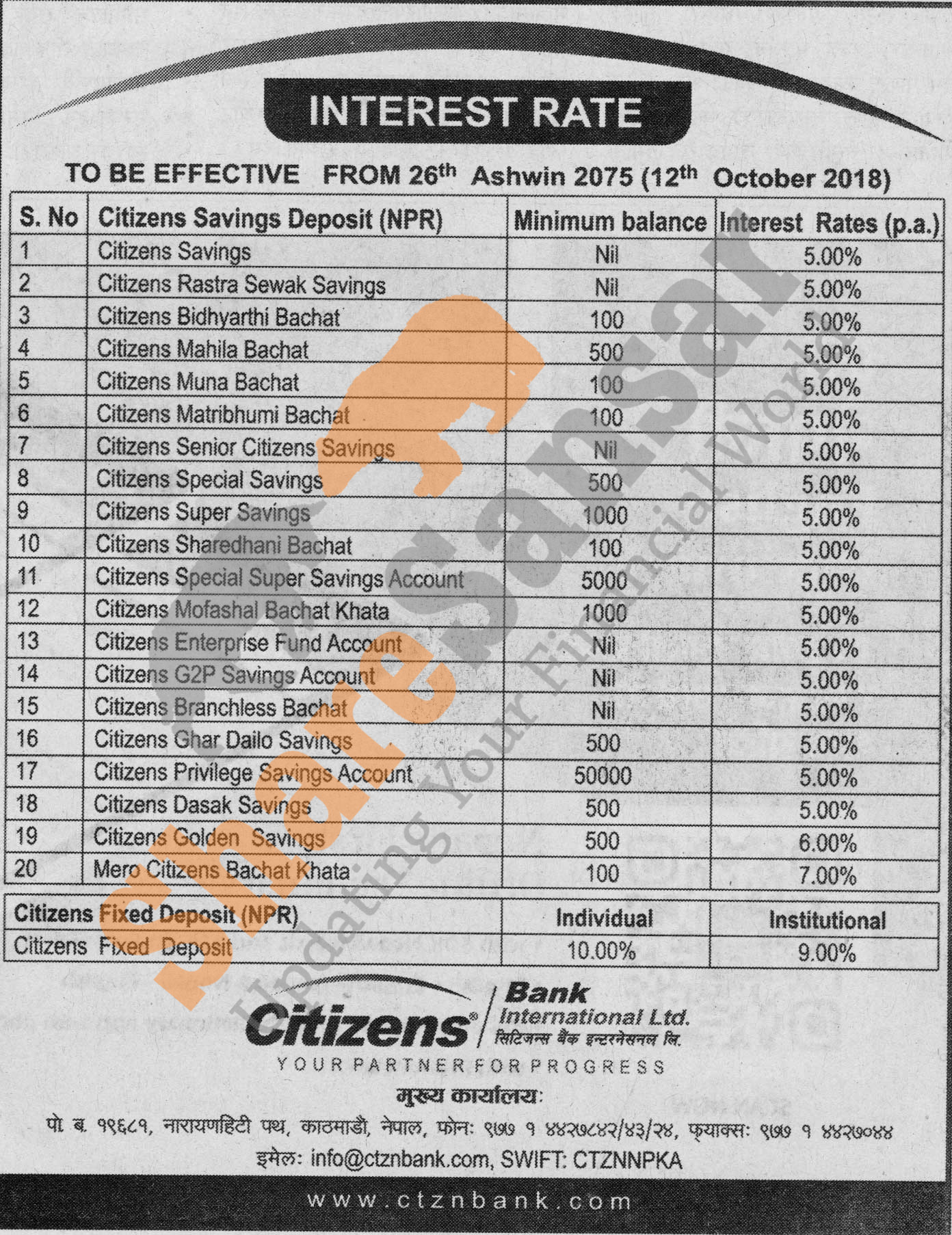 Citizens International Bank Limited has published a notice regarding new interest rate and its effective from 26th Ashwin, 2075.