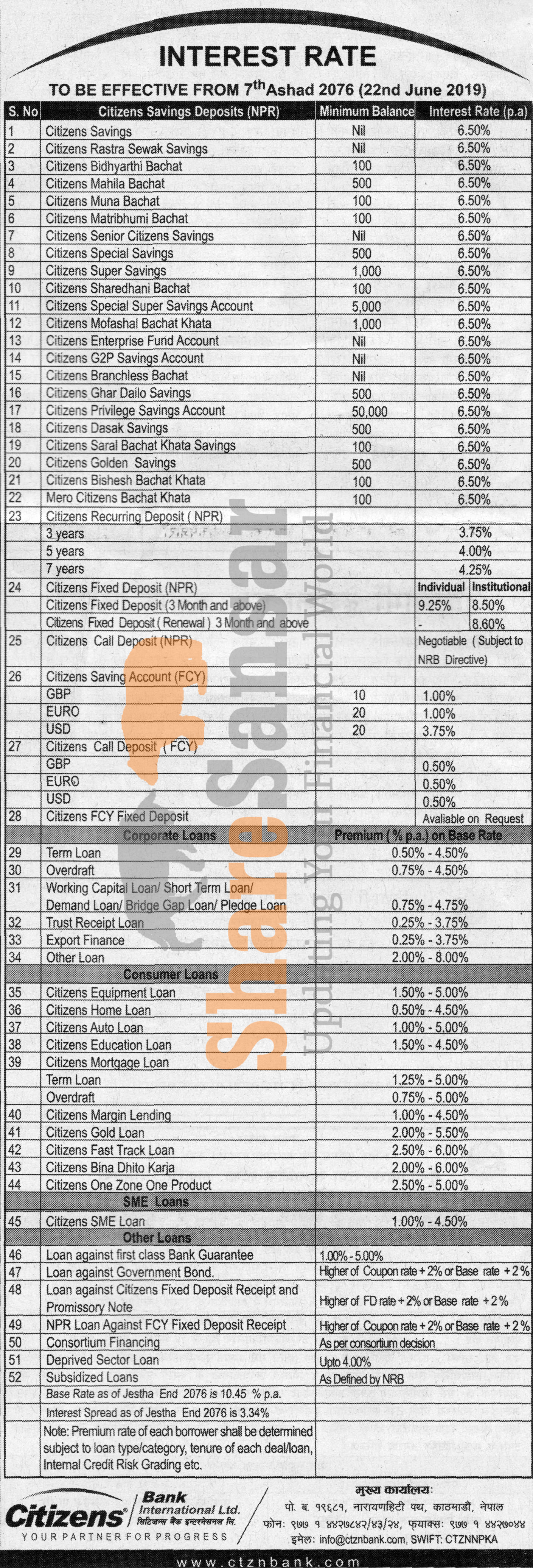 Citizens International Bank Limited has published a notice regarding new interest rate and its effective from 7th Ashad, 2076.