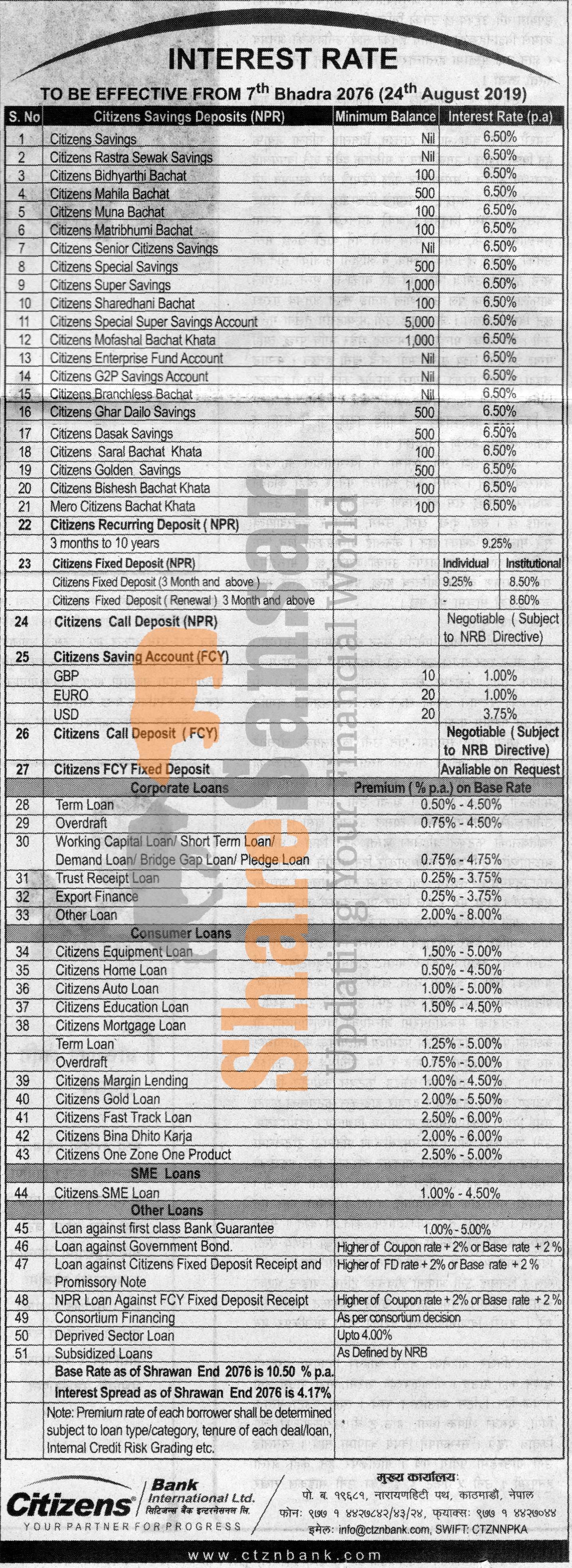Citizens International Bank Limited has published a notice regarding new interest rate and its effective from 7th Bhadra, 2076.
