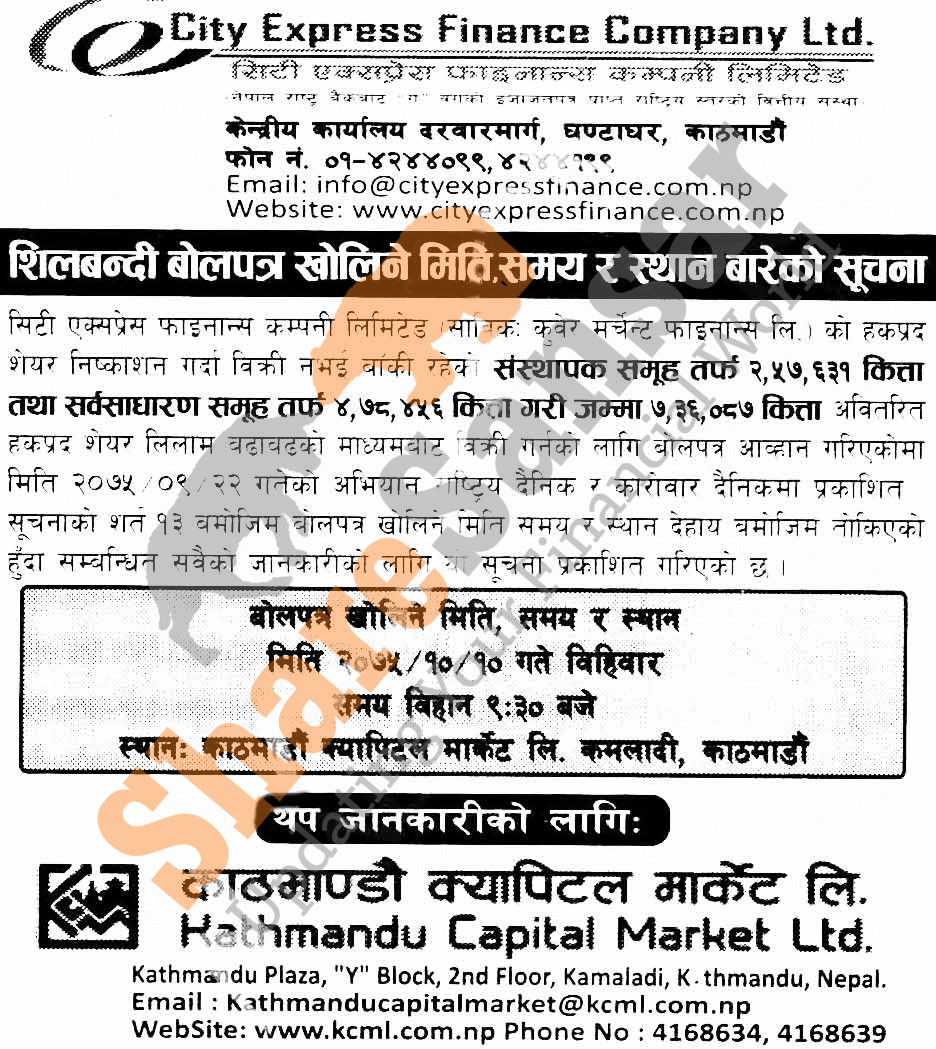 City Express Finance Company Limited has published a notice regarding bid opening date of 2,57,631 unit promoter shares and 4,78,456 unit ordinary shares in auction to the general public on today (10th Magh, 2075).