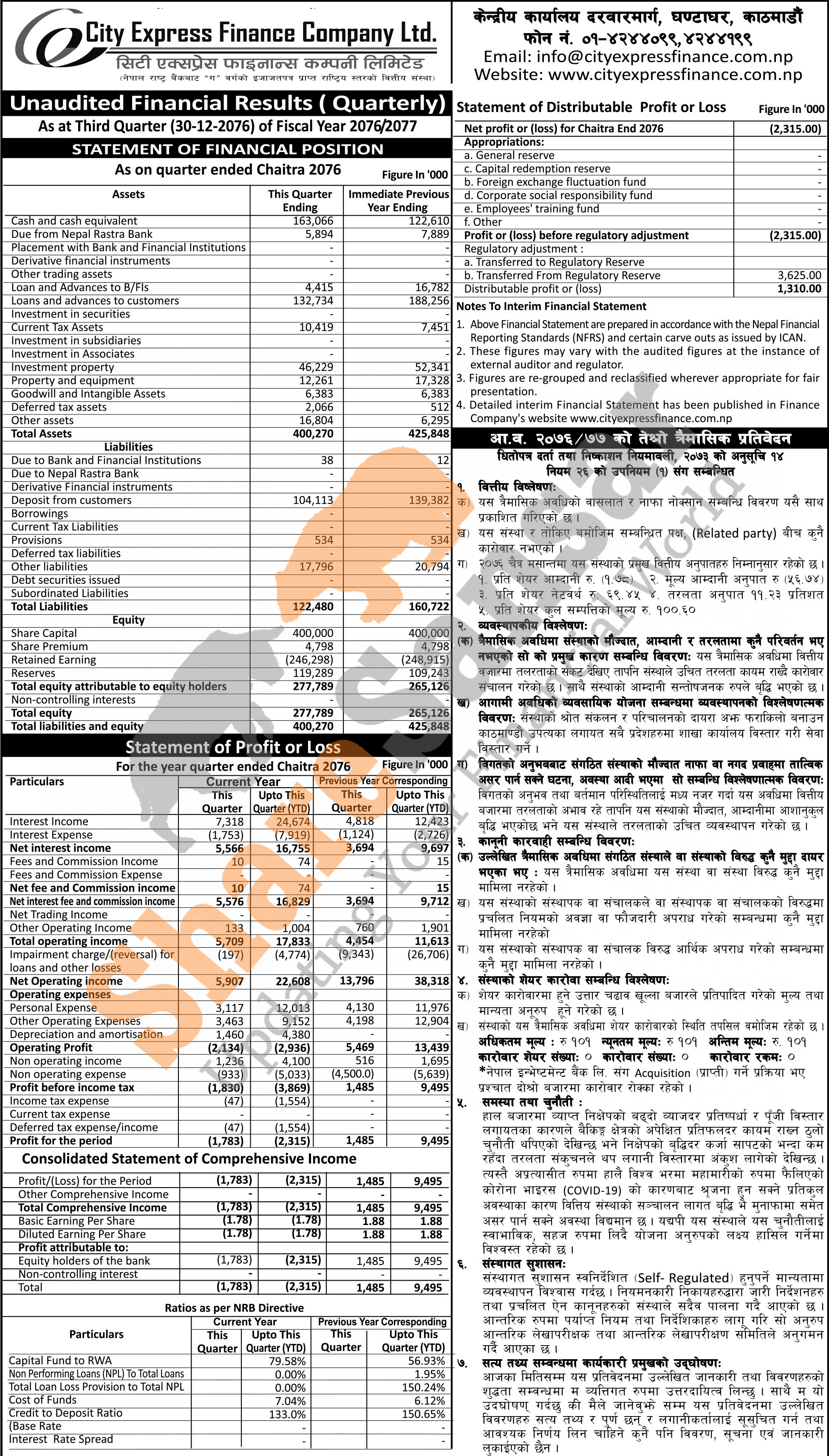City Express Finance Limited has posted a net loss of Rs 2.31 million and published its 3rd quarter company analysis of the fiscal year 2076/77.