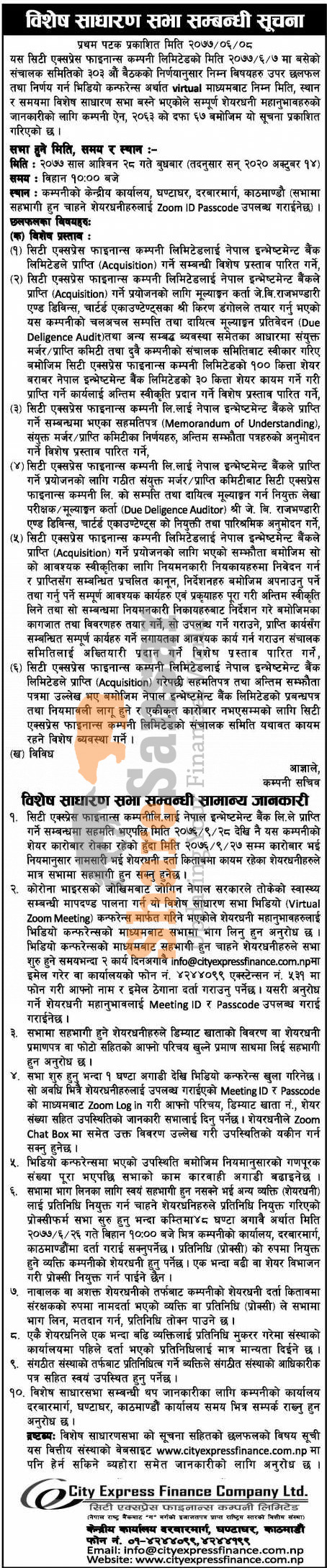 City Expresss Finance Company Limited has announced its SGM going to be held on 28th Ashwin, 2077.