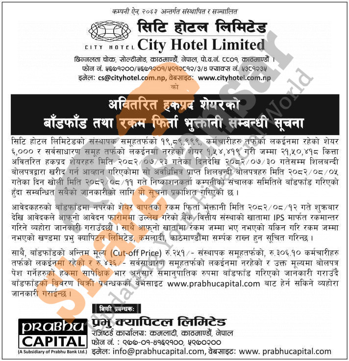 City Hotel Limited has allotted its 21,50,418 units of unsold promoters, employees and ordinary lock-in shares in an auction to the interested person/company/institutions on 11th Mangsir, 2082 and also has published a notice regarding its auction cut-off price.