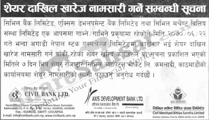 Civil Bank Limited, Axis Development Bank Limited and Civil Merchant Bittiya Sanstha Limited has jointly published a final notice requesting to send all BT share on name transfer.