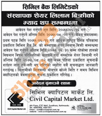 Civil Bank Limited has extended its 8,67,604 units promoter share in an auction to the general public till (2nd Mangsir, 2077).