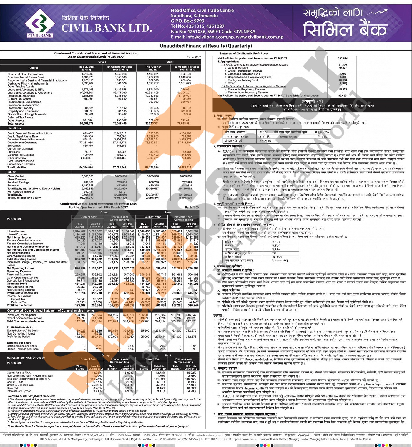 Civil Bank Limited has posted a net profit of Rs 202.88 million and published its 2nd quarter company analysis of the fiscal year 2077/78.