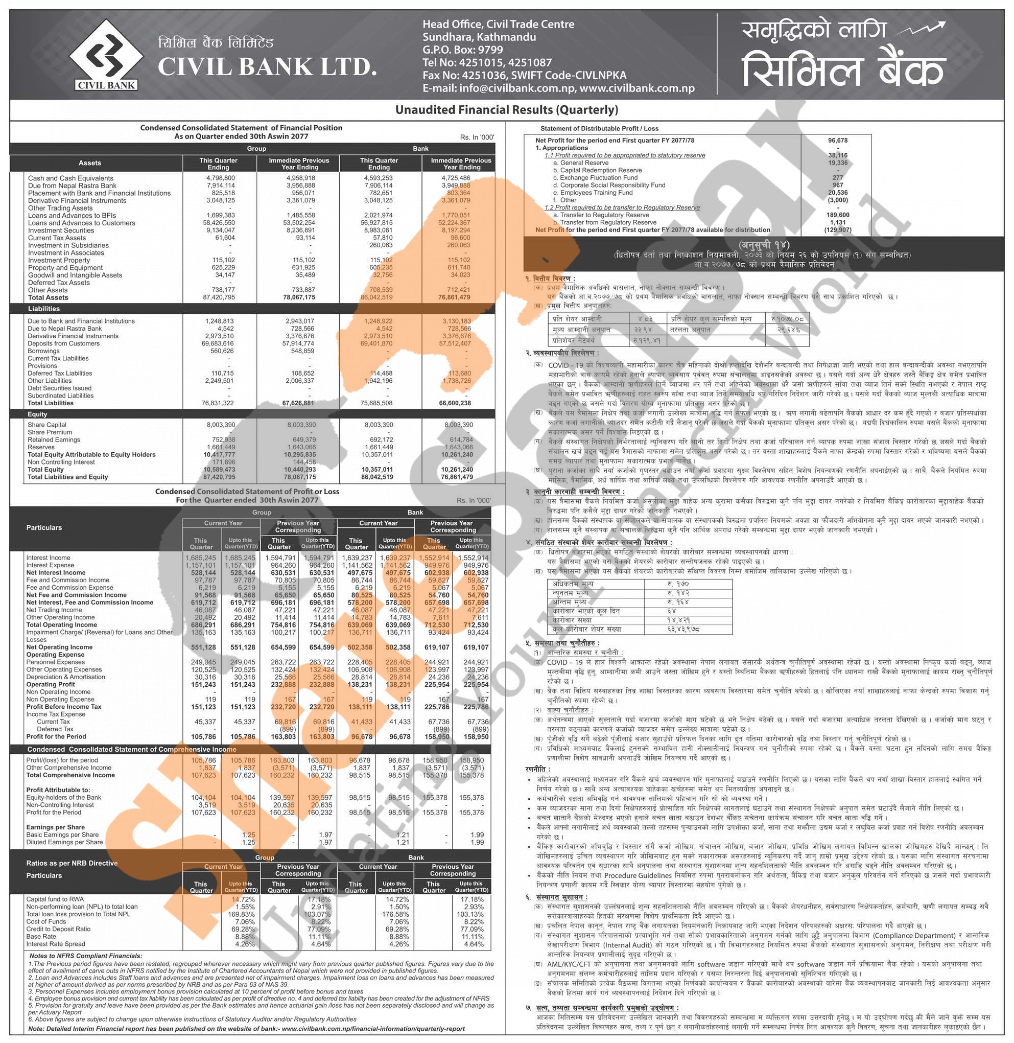 Civil Bank Limited has posted a net profit of Rs 96.67 million and published its 1st quarter company analysis of the fiscal year 2077/78.
