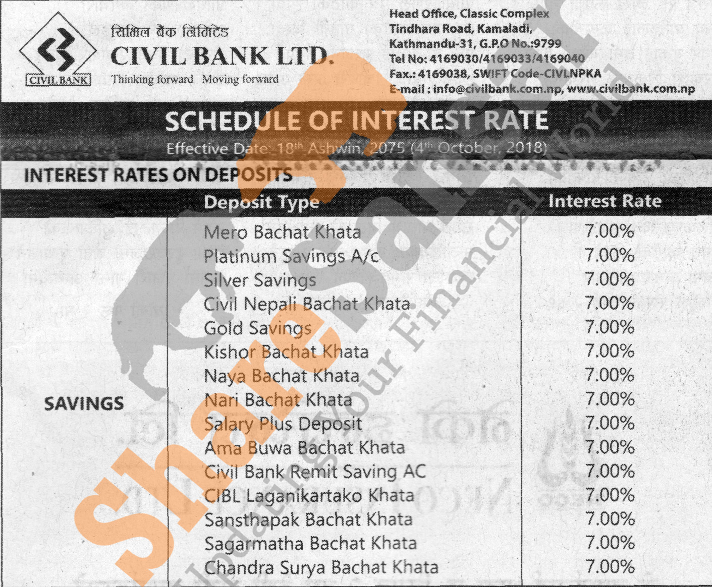 Civil Bank Limited has published a notice regarding new interest rate and its effective from 18th Ashwin, 2075.