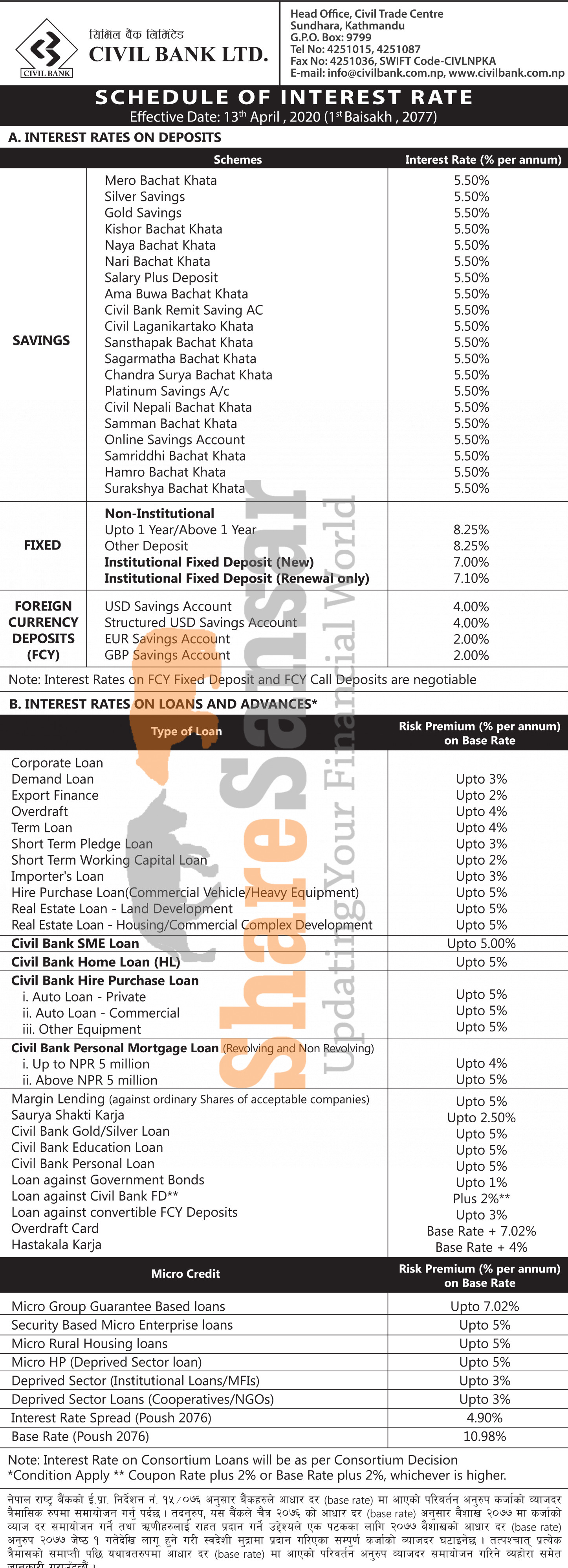 Civil Bank Limited has published a notice regarding new interest rate and its effective from 1st Baishakh, 2077.