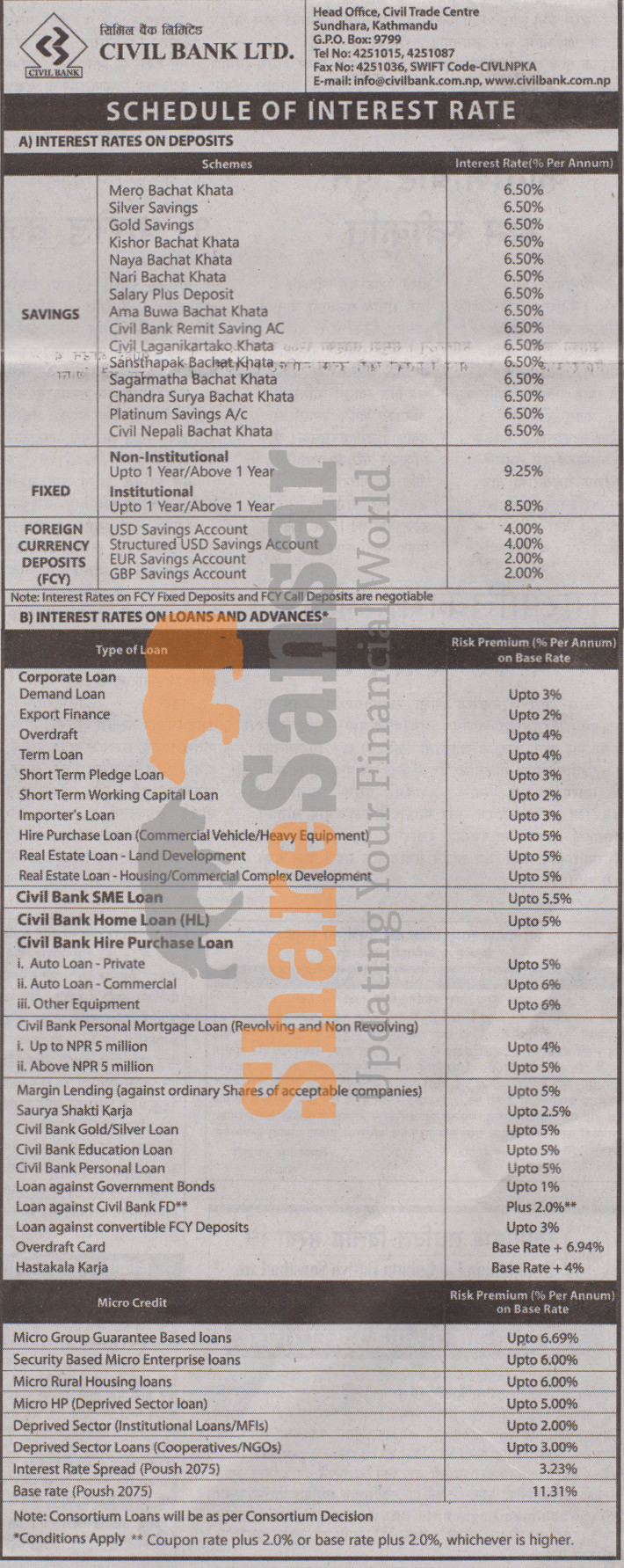 Civil Bank Limited has published a notice regarding new interest rate and its effective from 7th Magh, 2075.