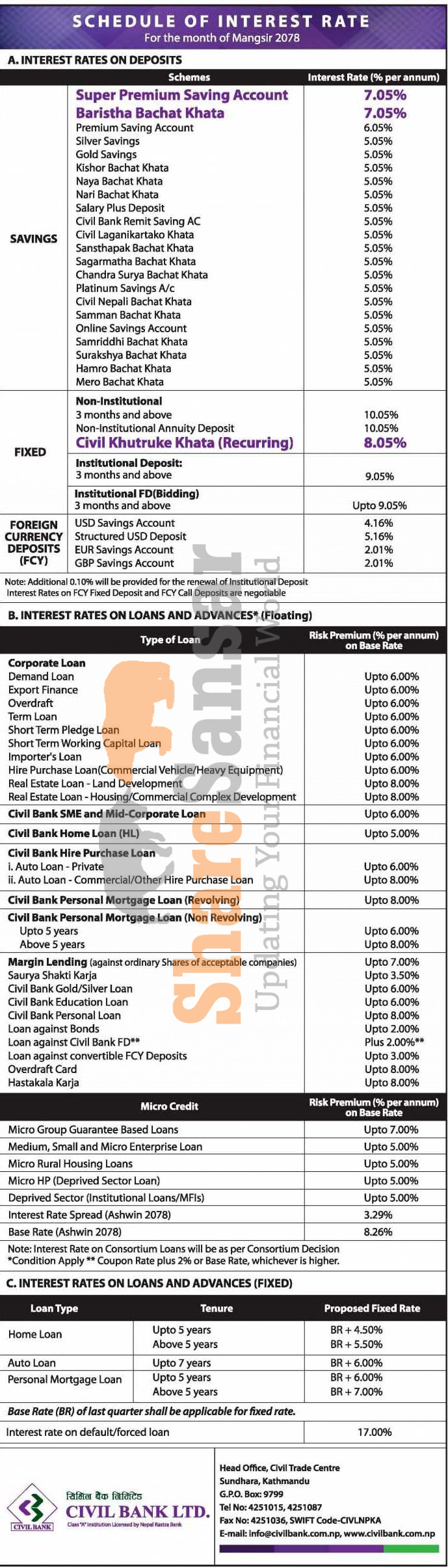 Civil Bank Limited has published a notice regarding the new interest rate for deposit and loan products and it's effective from 1st Mangsir, 2078.