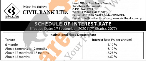Civil Bank Limited has published a notice regarding the new interest rate for its deposit and loan products and its effective from 17th Bhadra, 2077.
