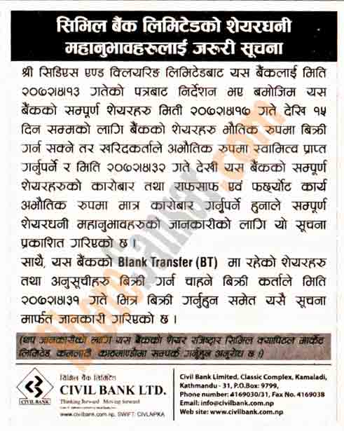 Civil Bank Limited has urges its shareholders to dematerialize their securities.