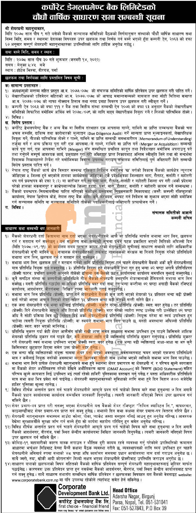 Corporate Development Bank Limited has announced its 14th AGM going to be held on 30th Poush, 2078.