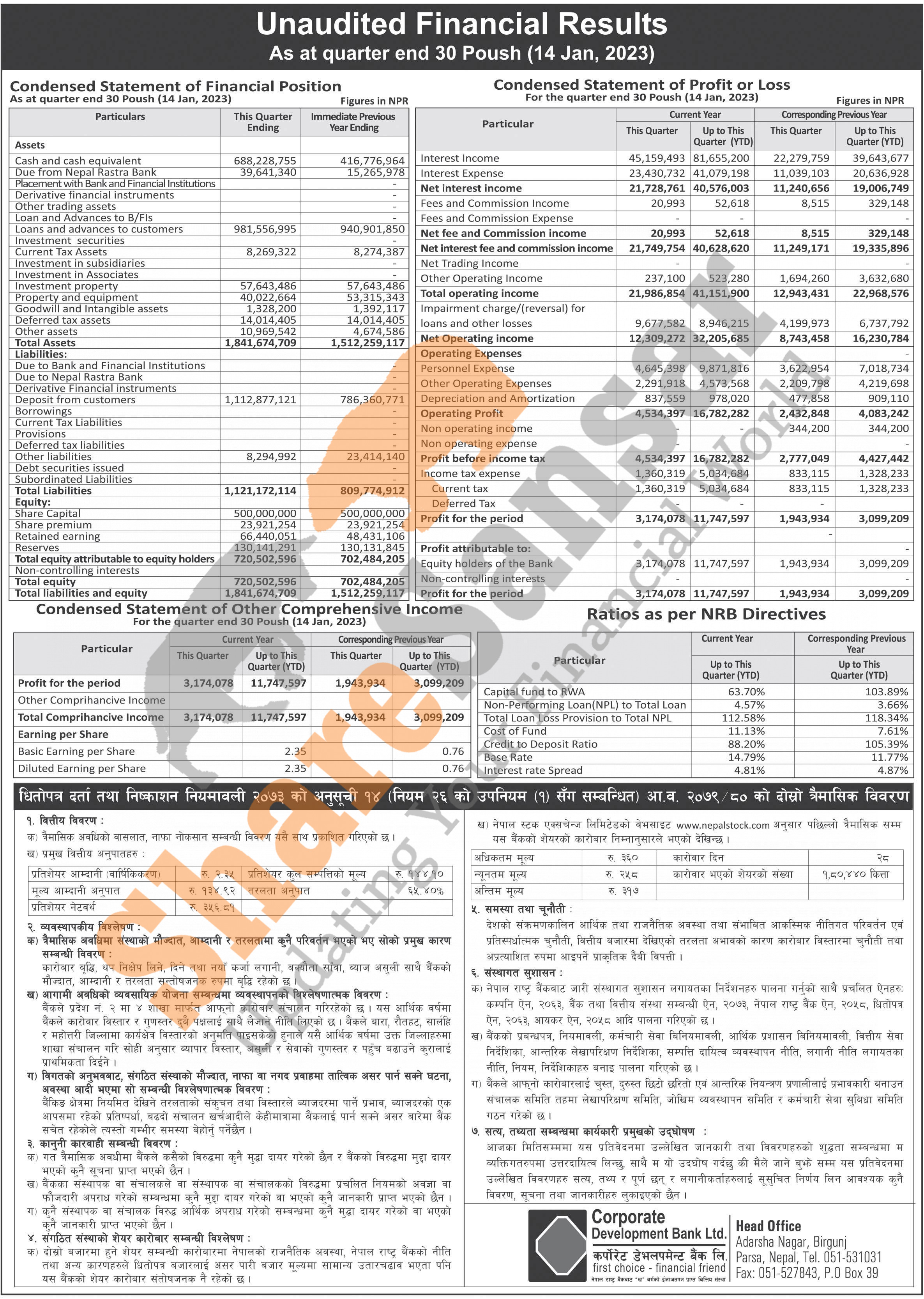 Corporate Development Bank Limited has posted a net profit of Rs 11.74 million and published its 2nd quarter company analysis of the fiscal year 2079/80.
