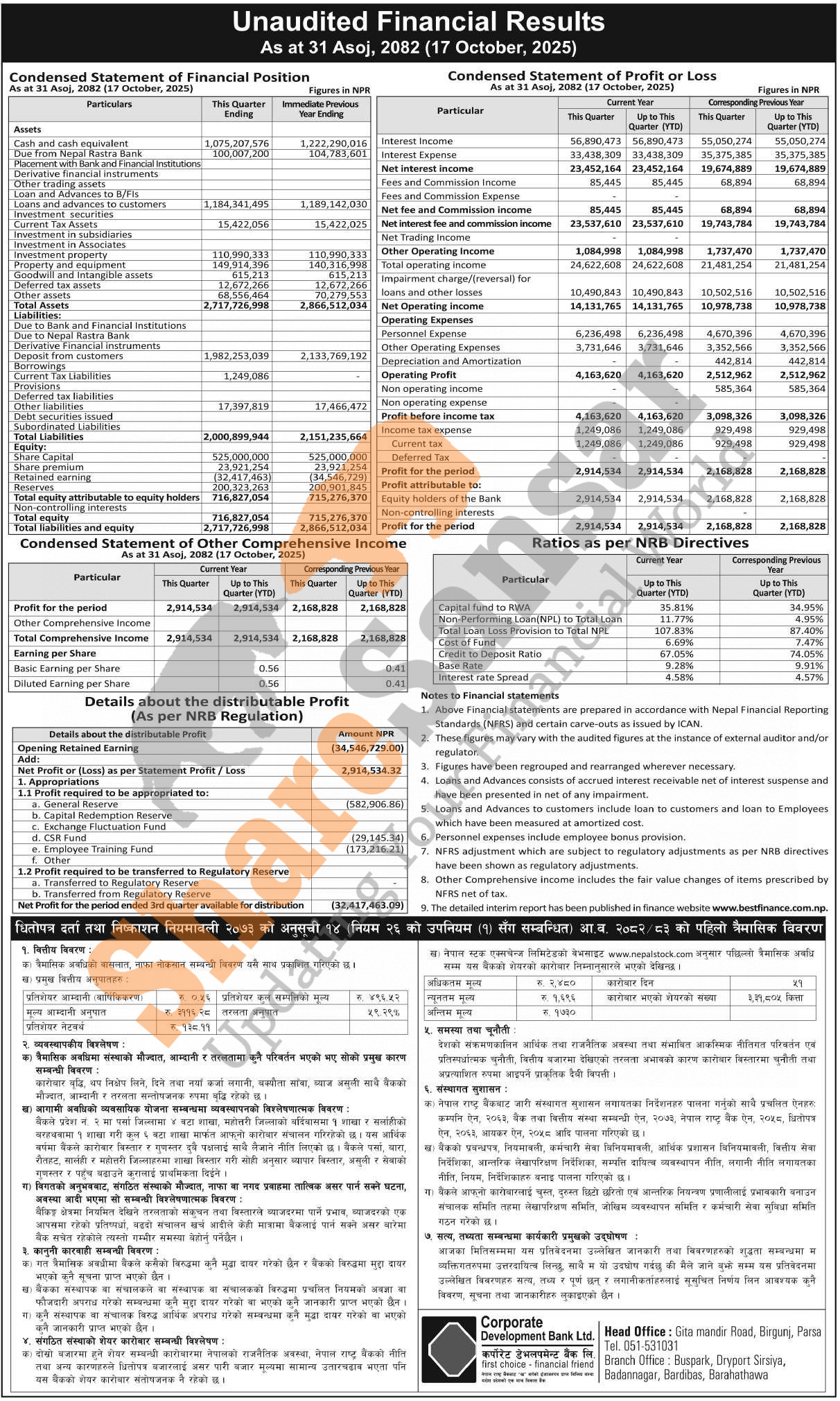 Corporate Development Bank Limited has posted a net profit of Rs 2.91 million and published its 1st quarter company analysis of the fiscal year 2082/83.