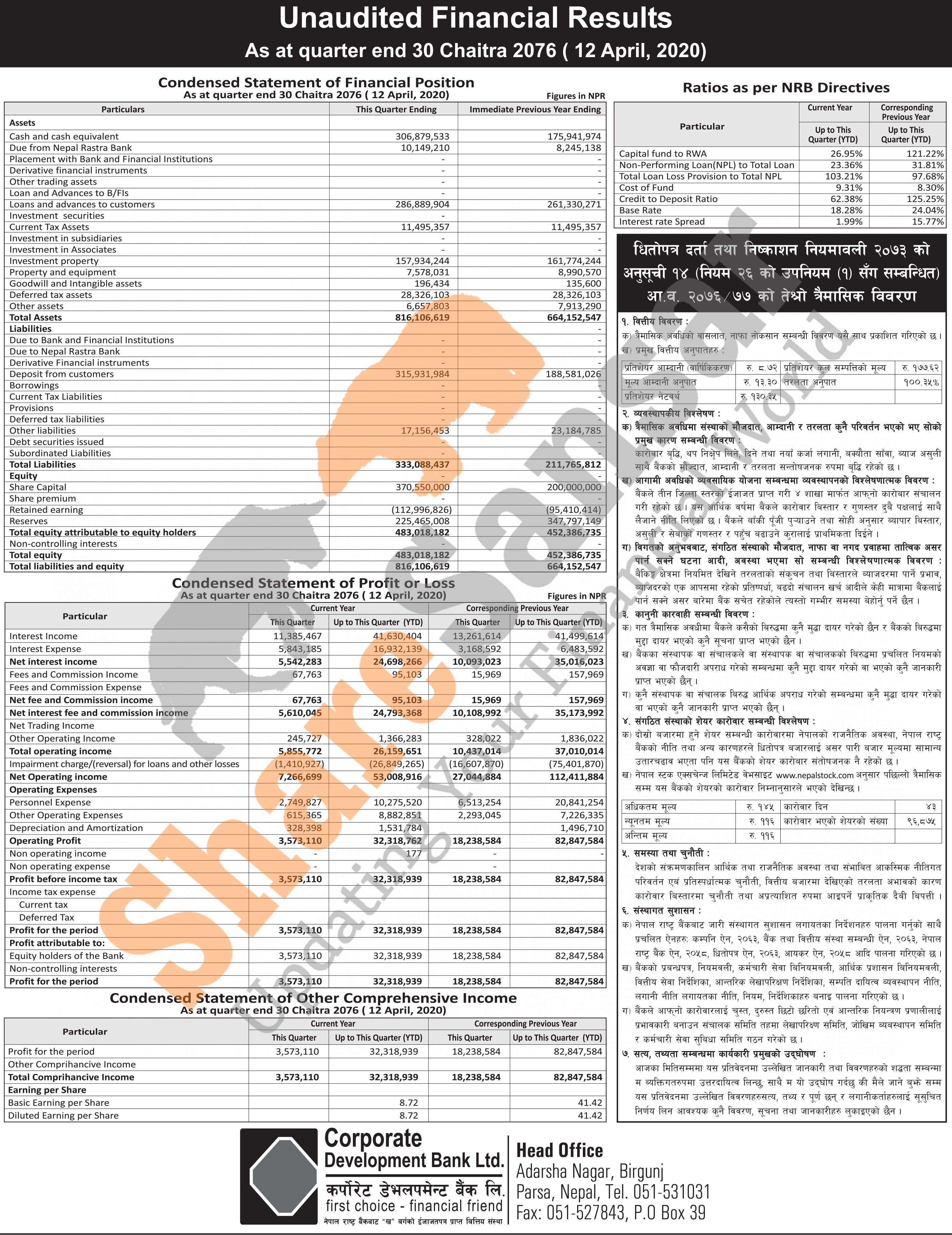 Corporate Development Bank Limited has posted a net profit of Rs 32.31 million and published its 3rd quarter company analysis of the fiscal year 2076/77.
