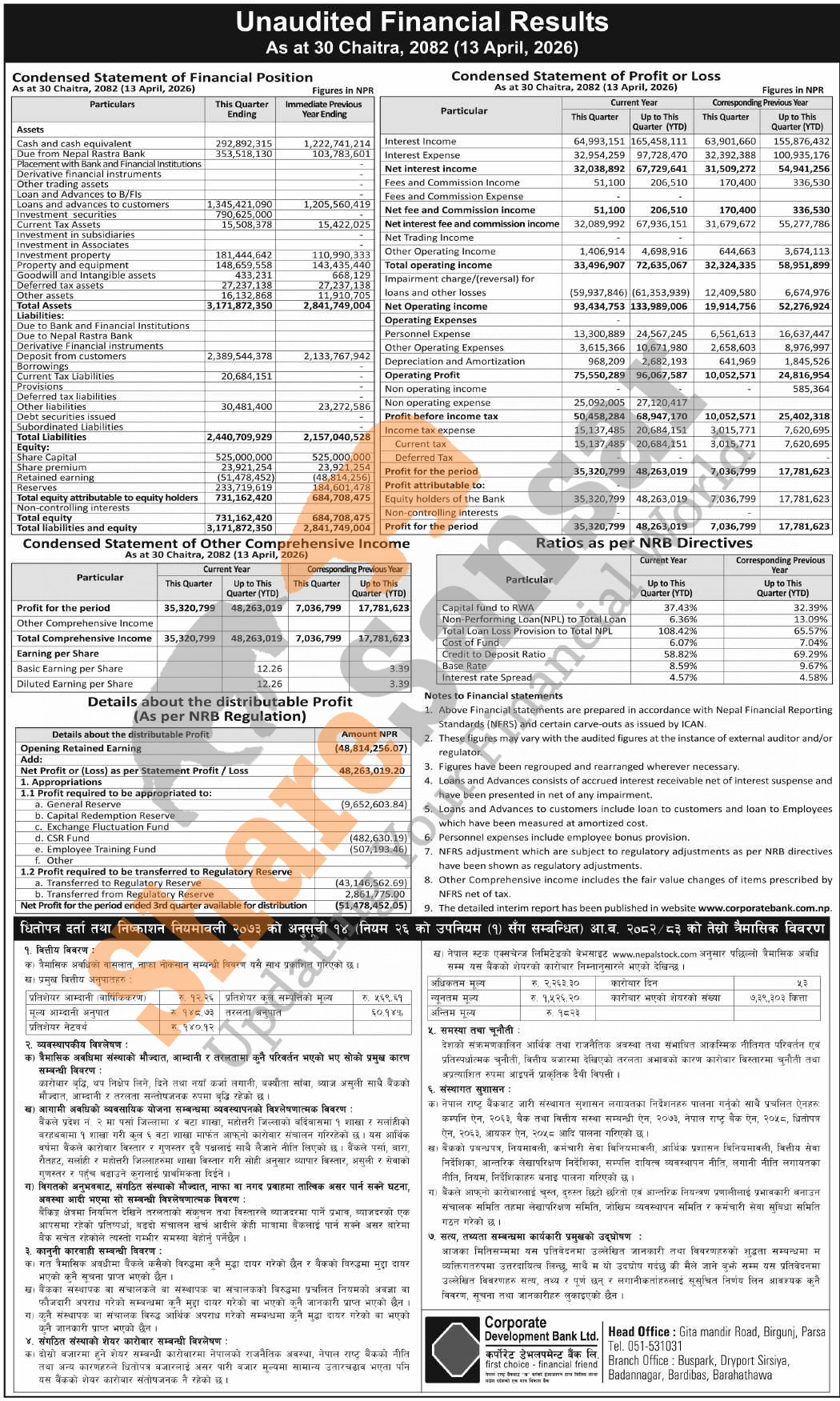 Corporate Development Bank Limited has posted a net profit of Rs 48.26 million and published its 3rd quarter company analysis of the fiscal year 2082/83.