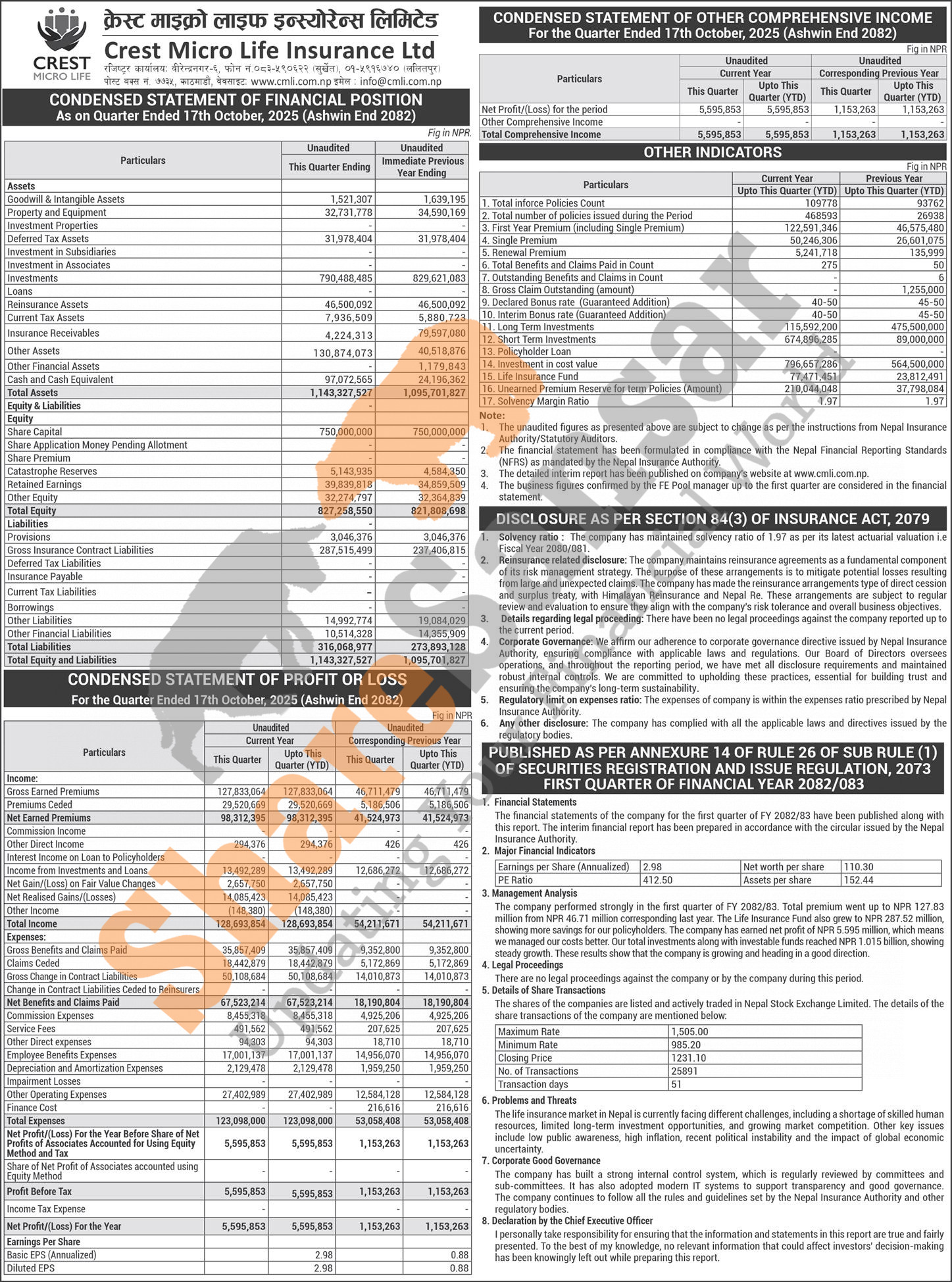 Crest Micro Life Insurance Limited has posted a net profit of Rs 5.59 million and published its 1st quarter company analysis of the fiscal year 2082/83.