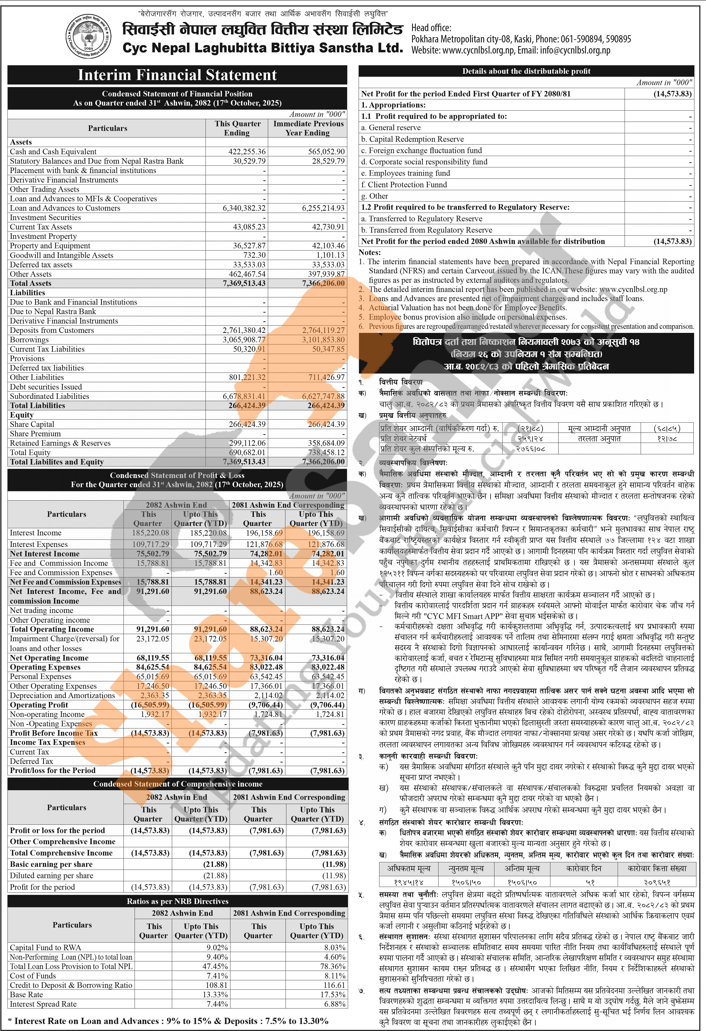 CYC Nepal Laghubitta Bittiya Sanstha Limited has posted a net loss of Rs 14.57 million and published its 1st quarter company analysis of the fiscal year 2082/83.