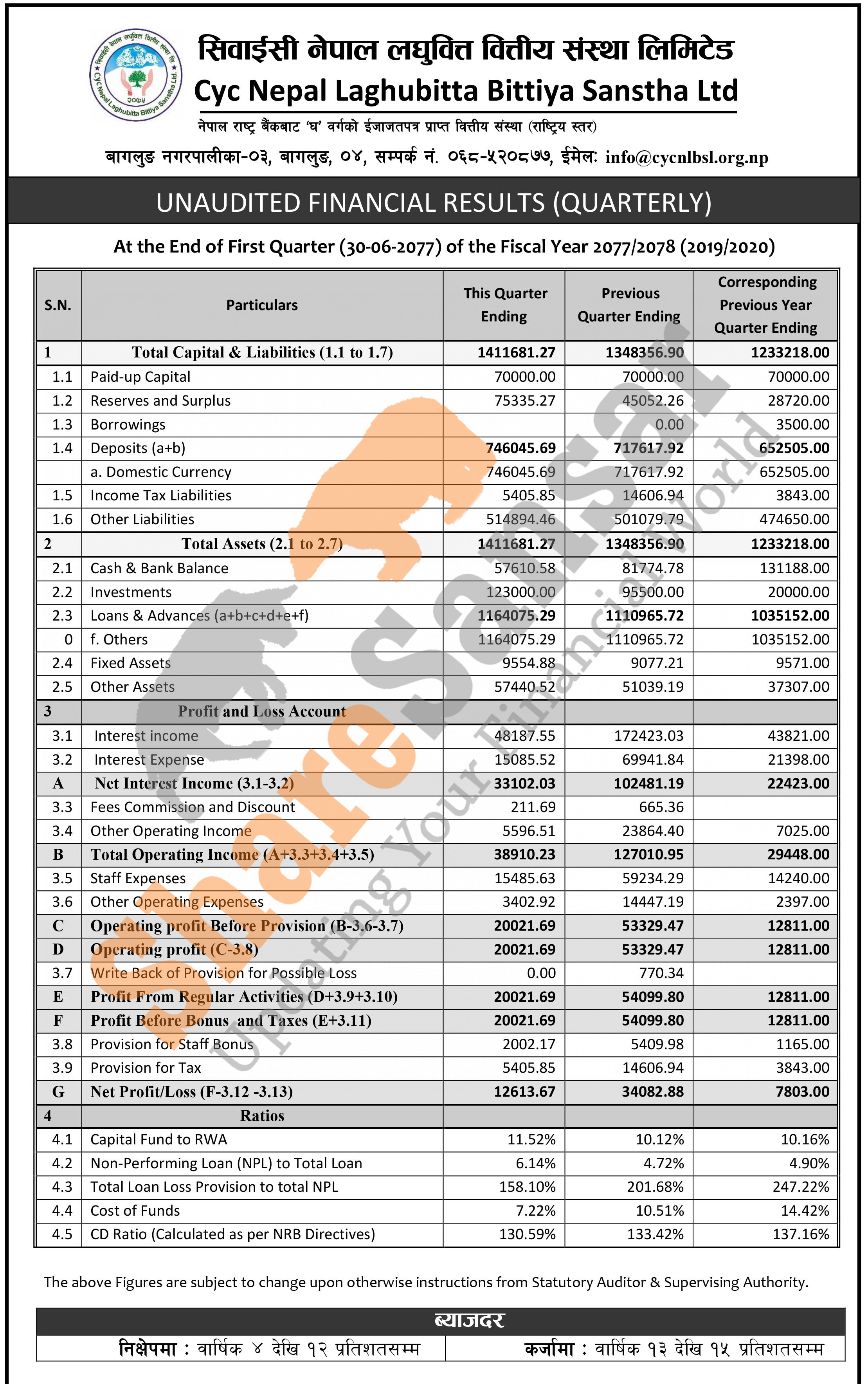 CYC Nepal Laghubitta Bittiya Sanstha Limited has posted a net profit of Rs 12.61 million and published its 1st quarter company analysis of the fiscal year 2077/78.