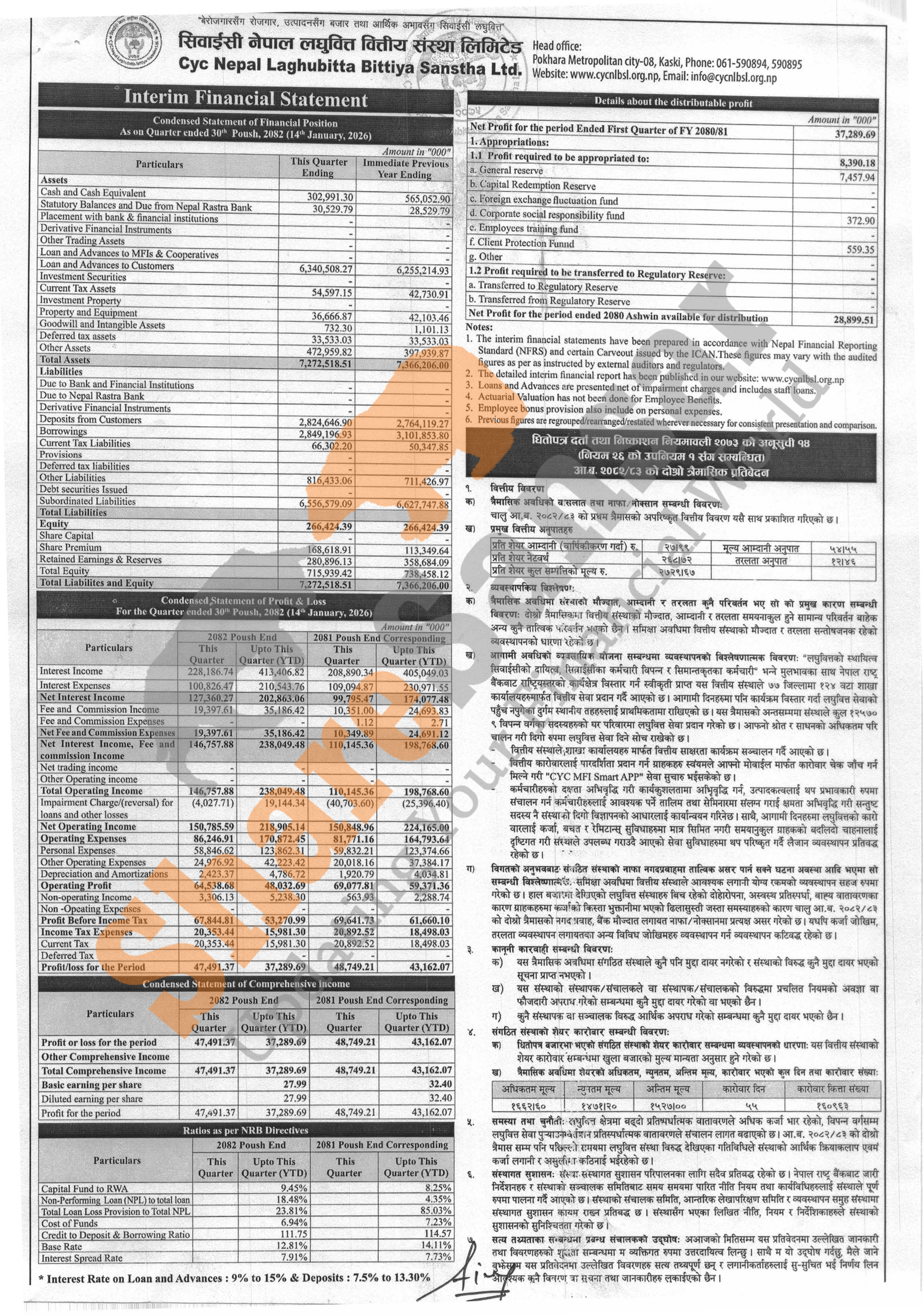 CYC Nepal Laghubitta Bittiya Sanstha Limited has posted a net profit of Rs 37.28 million and published its 2nd quarter company analysis of the fiscal year 2082/83.