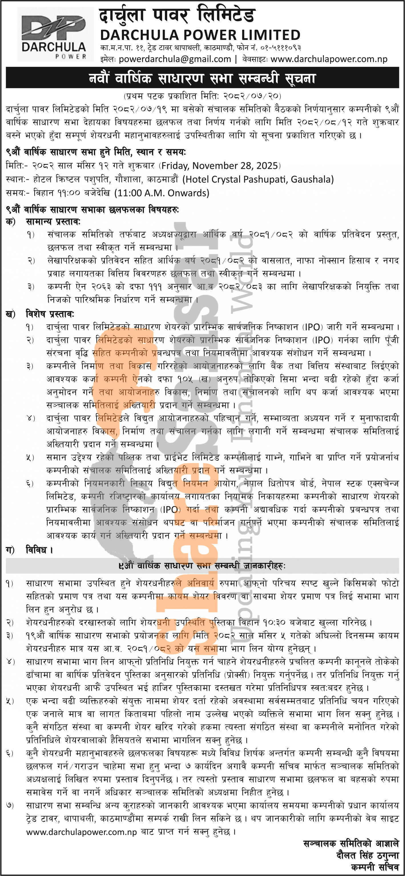 Darchula Power Limited has announced its 9th AGM going to be held on 12th Mangsir, 2082.