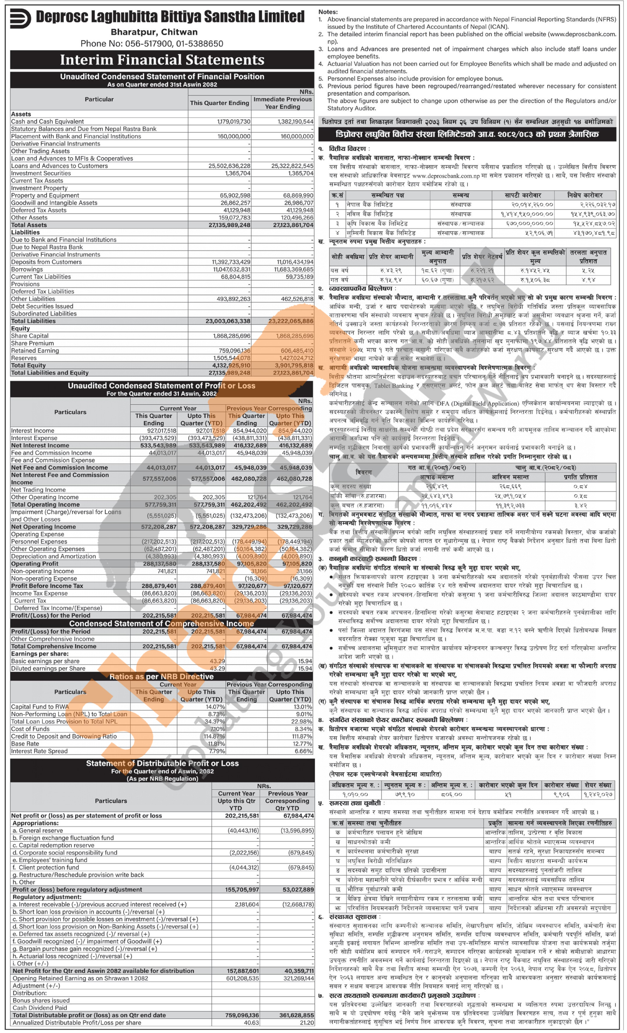 Deprosc Laghubitta Bittiya Sanstha Limited has posted a net profit of Rs 202.21 million and published its 1st quarter company analysis of the fiscal year 2082/83.