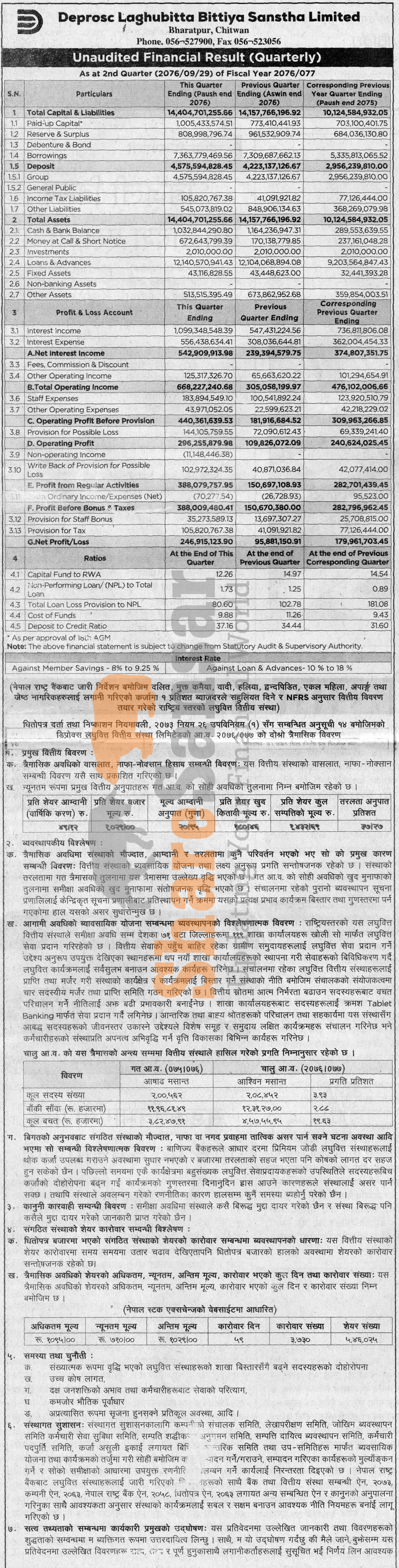 Deprosc Laghubitta Bittiya Sanstha Limited has posted a net profit of Rs 246.91 million and published its 2nd quarter company analysis of the fiscal year 2076/77.