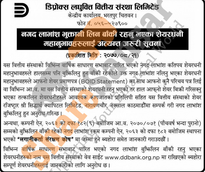 Deprosc Laghubitta Bittiya Sanstha Limited urges its shareholders to collect the uncollected due dividends.