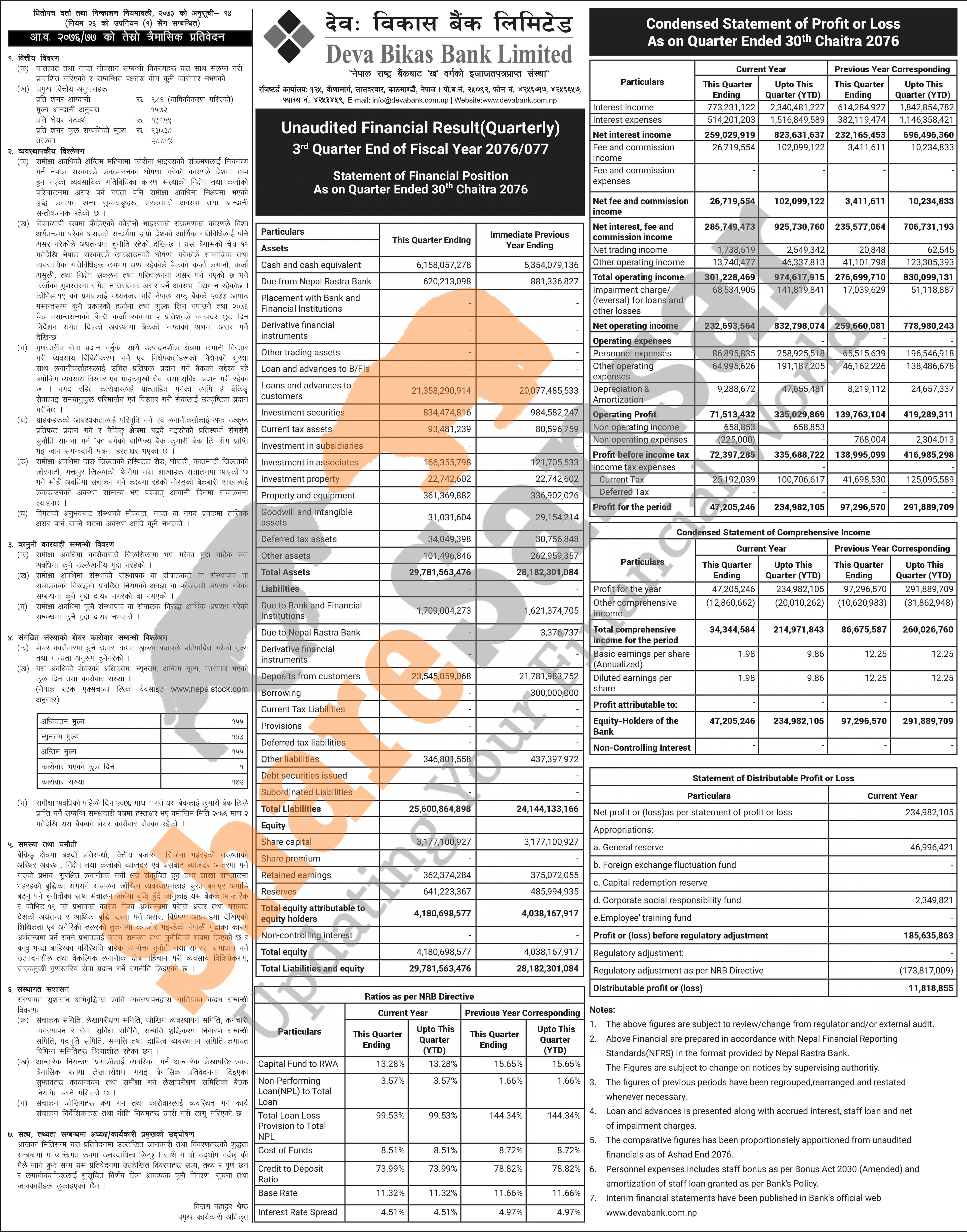 Deva Bikas Bank Limited has posted a net profit of Rs 234.98 million and published its 3rd quarter company analysis of the fiscal year 2076/77.
