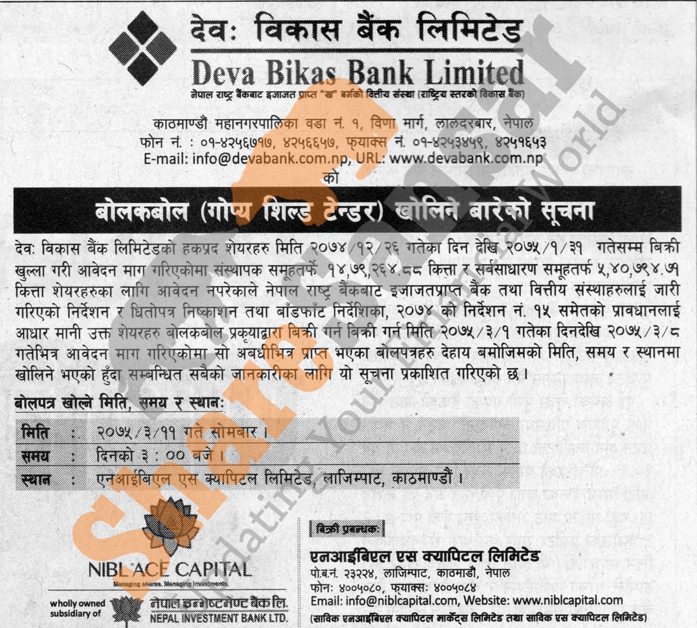 Deva Bikas Bank Limited has published a notice regarding bid opening date of 14,79,264.88 units promoter share and 5,40,794.71 units ordinary share in auction to the general public on (11th Ashad, 2075).