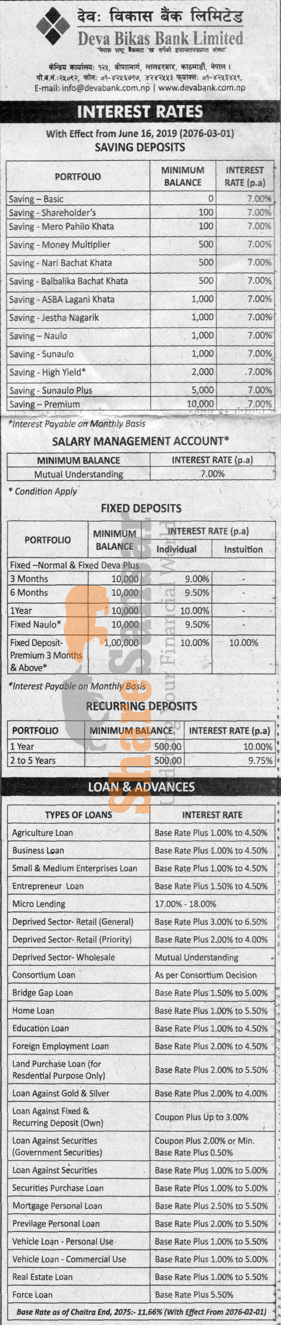 Deva Bikas Bank Limited has published a notice regarding new interest rate and its effective from 1st Ashad, 2076.