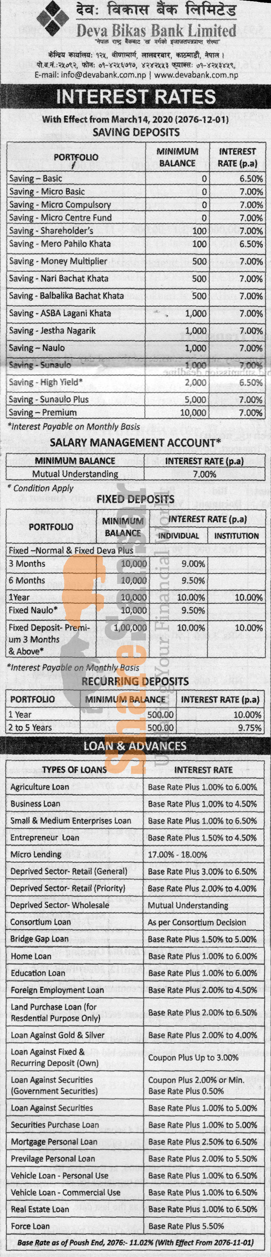 Deva Bikas Bank Limited has published a notice regarding new interest rate and its effective from 1st Chaitra, 2076.