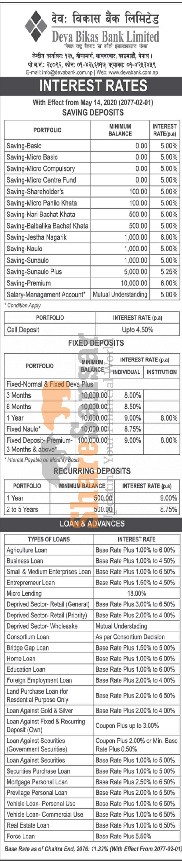 Deva Bikas Bank Limited has published a notice regarding new interest rate and its effective from 1st Jestha, 2077.