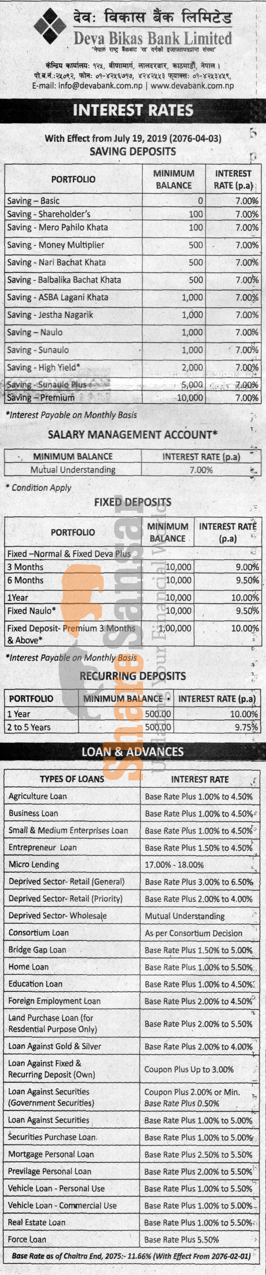 Deva Bikas Bank Limited has published a notice regarding new interest rate and its effective from 3rd Shrawan, 2076.