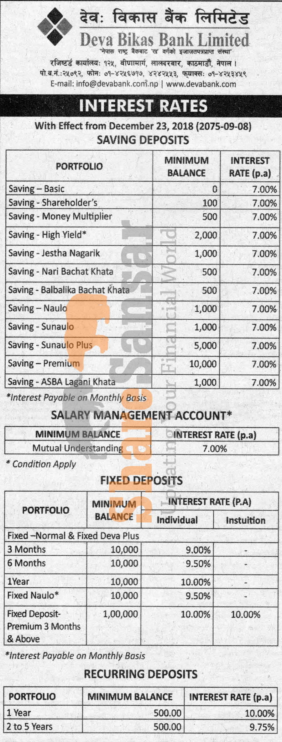 Deva Bikas Bank Limited has published a notice regarding new interest rate and its effective from 8th Poush, 2075.
