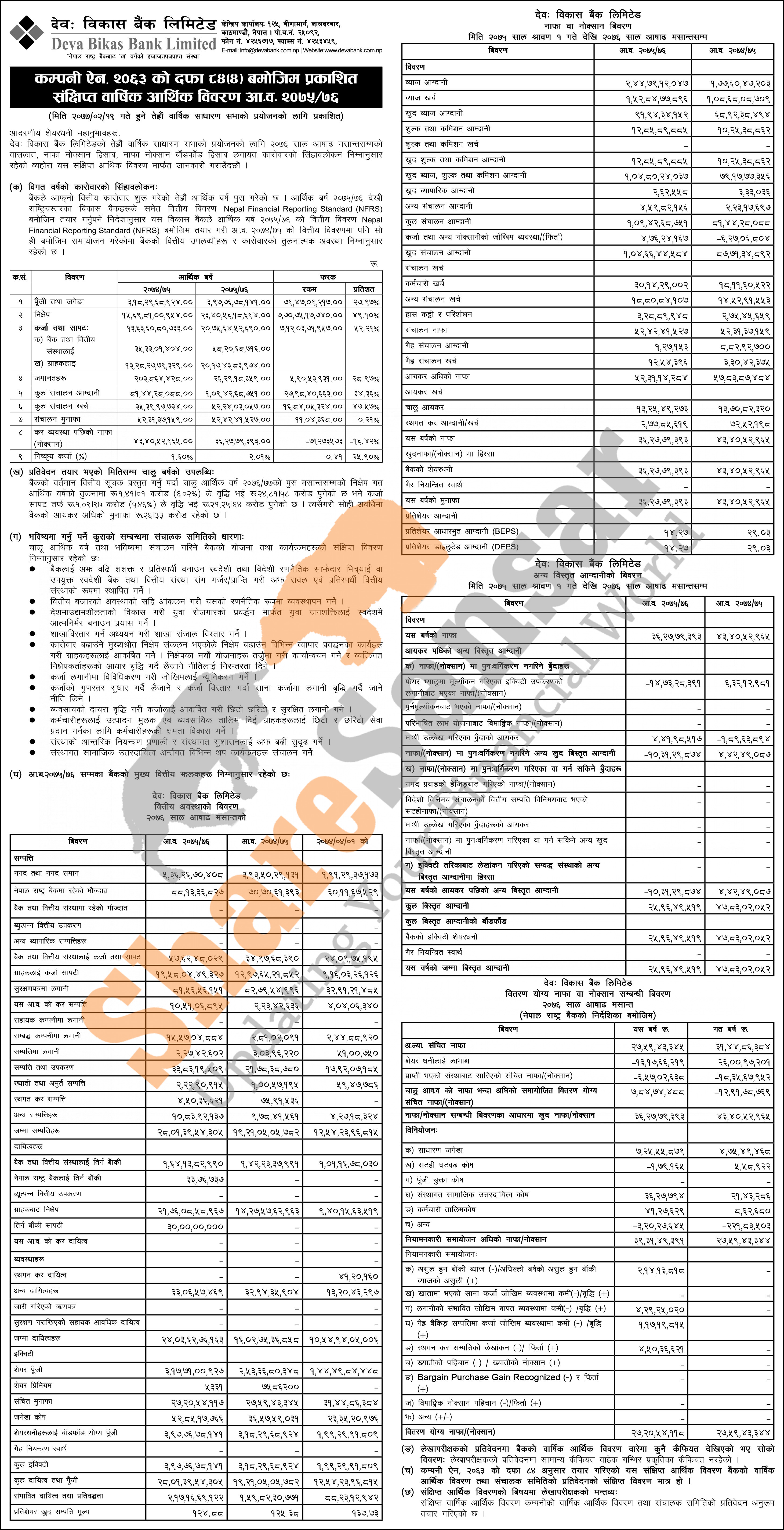 Deva Bikas Bank Limited has published its financial highlights of the fiscal year 2075/76.